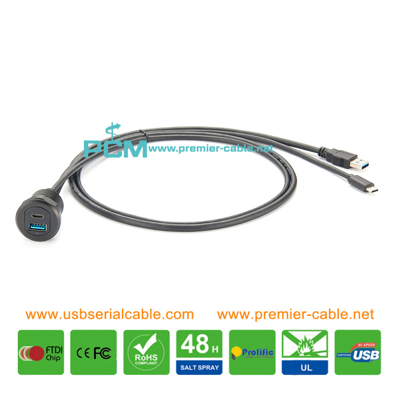 USB Type C to USB Type A Dual Ports Panel Mount Cable