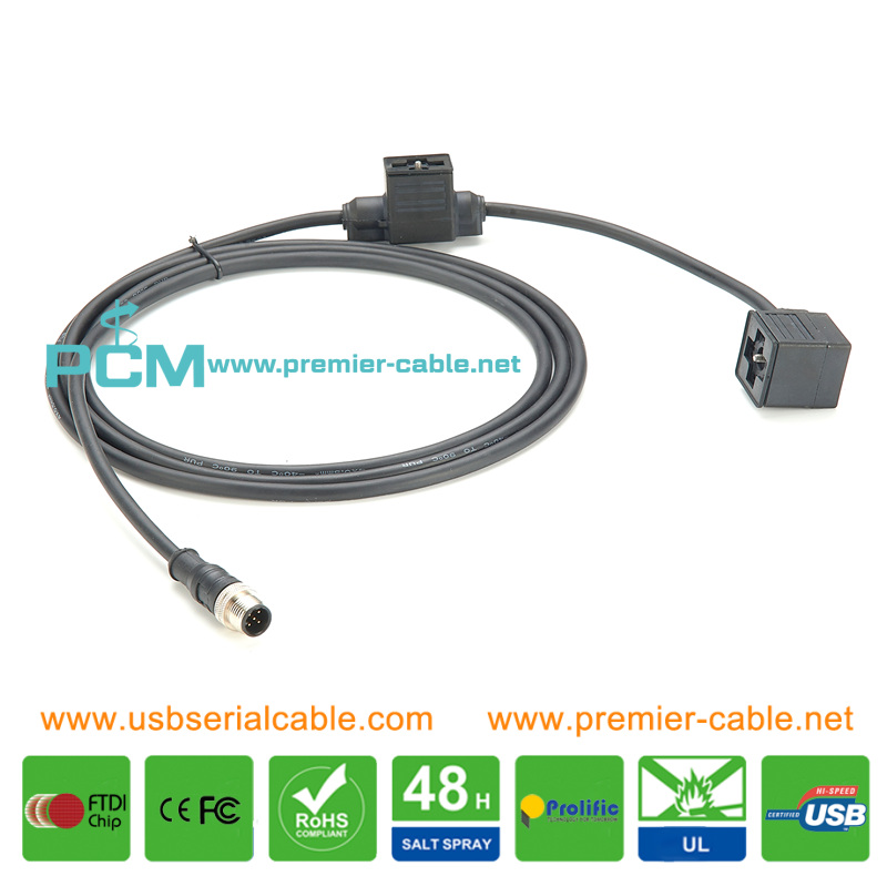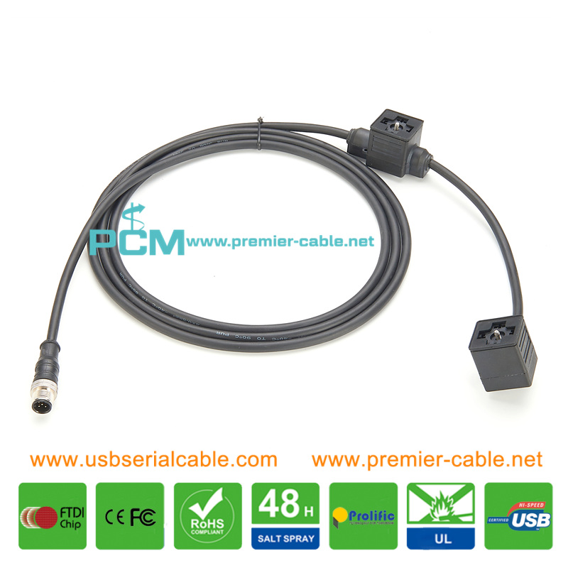 Item: Industrial Sensor Valve Cable Connector A: DIN 43650 Form A Connector B: M12 Length: 10/20/30/50cm or customized Gender: Female-Female/Female-Male/Male-Male or customized Manufacturer: Premier Cable